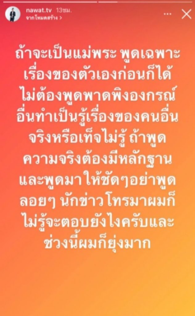 และอีกสตอรี่บอกว่า “ถ้าจะเป็นแม่พระ พูดเฉพาะเรื่องของตัวเองก็ได้ ไม่ต้องพาดพิงองค์กรอื่น ทำเป็นรู้เรื่องของคนอื่น นักข่าวโทรมาถาม ไม่รู้จะตอบยังไง เพราะช่วงนี้ก็ยุ่งมาก”