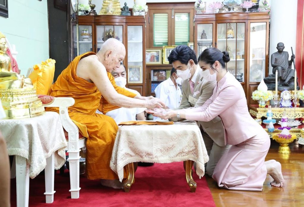 โดยทั้งคู่เกี่ยวก้อยเดินทางกันไปที่ ณ วัดราชบพิธสถิตมหาสีมารามราชวรวิหาร เพื่อเข้าเฝ้าถวายสักการะและรับประทานพร จากเจ้าพระคุณ สมเด็จพระอริยวงศาคตญาณ สมเด็จพระสังฆราช สกลมหาสังฆปริณายก