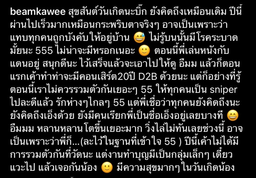 “สุขสันต์วันเกิดนะบิ๊ก ยังคิดถึงเหมือนเดิม ปีนี้ผ่านไปเร็วมากเหมือนกระพริบตาจริงๆ อาจเป็นเพราะว่าแทบทุกคนถูกบังคับให้อยู่บ้าน ไม่รู้บนนั้นมีโรคระบาดมั้ยนะ 555 ไม่น่าจะมีหรอกเนอะ ตอนนี้พี่เล่นหนังกับแดนอยู่ สนุกดีนะ ไว้เสร็จแล้วจะเอาไปให้ดู อืมม แล้วก็ตอนแรกเค้าทำท่าจะมีคอนเสิร์ต20ปี D2B ด้วยนะ แต่ก็อย่างที่รู้ตอนนี้เราไม่ควรรวมตัวกันเยอะๆ 55 ให้ทุกคนเป็น sniper ไปละดีแล้ว รักห่างๆไกลๆ 55 แต่พี่เชื่อว่าทุกคนยังคิดถึงนะ ยังคิดถึงเอ็งด้วย ยังมีคนเรียกพี่เป็นชื่อเอ็งอยู่เลยบางที อืมมม หลานหลานโตขึ้นเยอะมาก วิ่งไล่ไม่ทันเลยช่วงนี้ อาจเป็นเพราะว่าพี่ก็…(ละไว้ในฐานที่เข้าใจ 55 ) ปีนี้เค้าไม่ได้มีการรวมตัวกันที่วัดนะ แต่งานทำบุญมีเป็นกลุ่มเล็กๆ เดี๋ยวแวะไป แล้วเจอกันน้อง มีความสุขมากๆในวันเกิดน้อง”