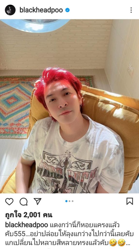 ล่าสุดปรับลุคส์สีผมจากหัวทองเป็นสีแดงสุดแซ่บ กระชากวัยให้แฟนเพลงได้ว๊าวกันอีกครั้ง เจ้าตัวได้โพสต์ผ่าน IG พร้อมข้อความว่า “แดงกว่านี้ก็หอยแครงแล้วคับ55…อย่าปล่อยให้ลุงแกว่างไปกว่านี้เลยคับ แกเปลี่ยนไปหลายสีหลายทรงแล้วคับ…” หลายคนชมว่าหล่อกระชากวัย  สีผมเหมาะกับสายร็อค ออร่าจับ  หยิบแว่นดำมาใส่นิดจะเท่สุดๆ ไปเล้ย…..จนแอบสงสัยว่าจะมีโปรเจกต์อะไรต่อจากนี้อีกน๊า  ที่แน่ๆ  แว่วว่าเร็วๆ นี้ วง BLACKHEAD จะกลับมาทำเพลงให้ได้ฟังกันอีกครั้ง สายโซเชียลห้ามพลาด   ปักหมุดตามให้กำลังใจกันได้เลยจ้า