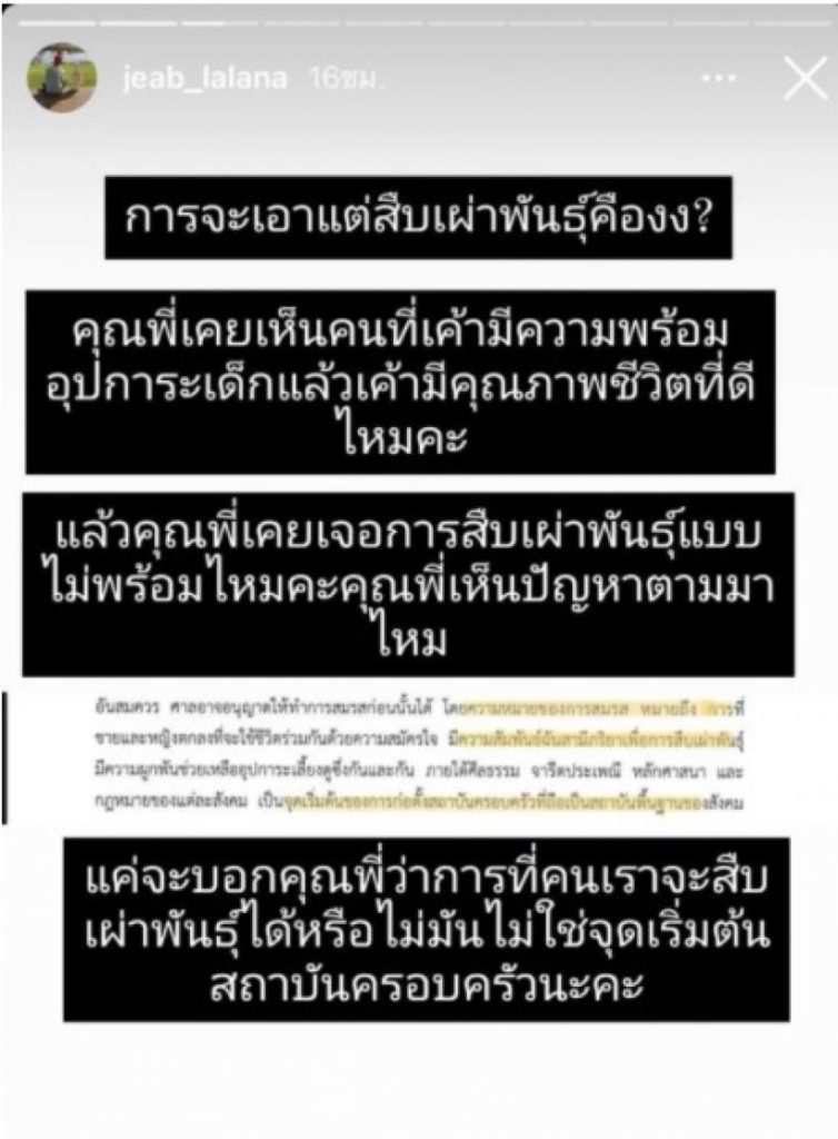 “การจะเอาแต่สืบพันธุ์คืองง? คุณพี่เคยเห็นคนที่เขามีพร้อมอุปการะเด็กแล้วเขามีคุณภาพชีวิตที่ดีไหมคะ แล้วคุณพี่เคยเจอการสืบพันธุ์แบบไม่พร้อมไหมคะ คุณพี่เห็นปัญหาตามมาไหม แค่จะบอกคุณพี่ว่า การที่คนเราจะสืบเผ่าพันธุ์ได้หรือไม่ มันไม่ใช่จุดเริ่มต้นสถาบันครอบครัวนะคะ”