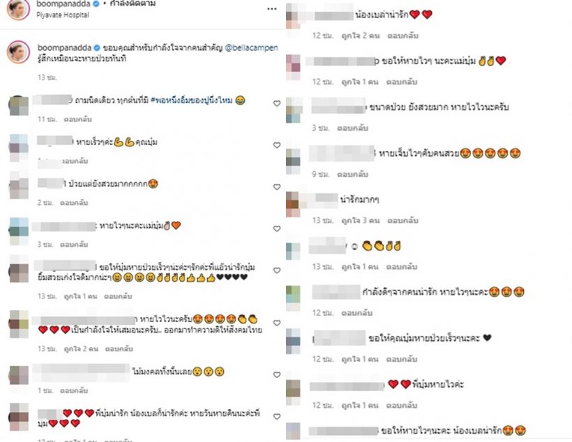 หนึ่งในคนที่ห่วงเธอสุดๆก็คือ “เบลล่า ราณี” ที่งานนี้ได้ส่งกำลังใจมาให้บุ๋มเป็นต้นไม้ขนาดเล็ก โดยแม่บุ๋มโพสต์ภาพคู่ต้นไม้ของเบลล่า พร้อมแคปชั่นบอกว่า “ขอบคุณสำหรับกำลังใจจากคนสำคัญ @bellacampen รู้สึกเหมือนจะหายป่วยทันที” ท่ามกลางแฟนคลับเข้ามาแสดงความห่วงใยและชื่นชมเบลล่าจำนวนมาก