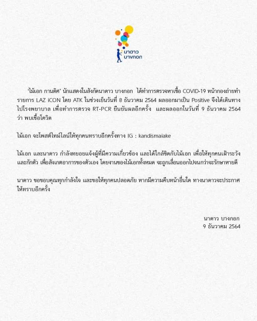 นาดาว บางกอก ร่อนแถลงการร์แจ้งข่าวว่า “ไม้เอก กานดิส” ติดเชื้อไวรัสโควิด-19 หลังตรวจATKและผลออกมาเป็นบวก จึงตรวจแบบPCRซ้ำ และพบว่าผลยังคงเป็นบวก ทางค่ายได้ทยอยแจ้งผู้ที่มีความเกี่ยวข้อง และใกล้ชิดให้เฝ้าระวังและกักตัว เพื่อสังเกตอาการตัวเอง พร้อมเลื่อนตารางงานของศิลปินออกไปจนกว่าจะรักษาตัวหายดี