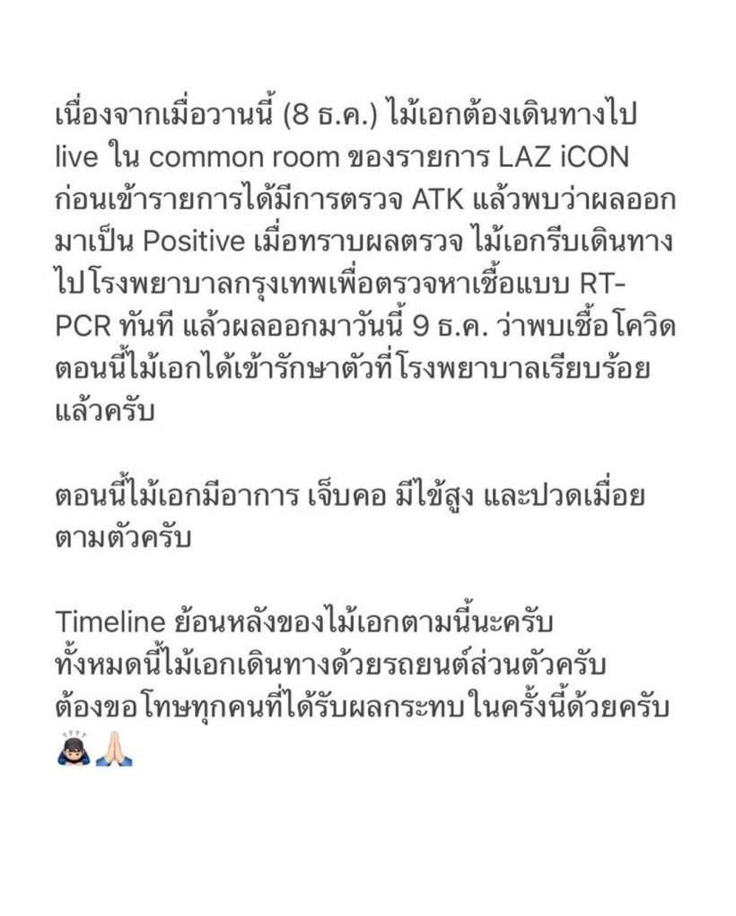 “ไม้เอก กานดิส” ติดโควิดพร้อมแจ้งไทม์ไลน์