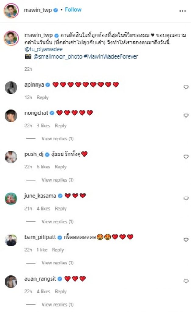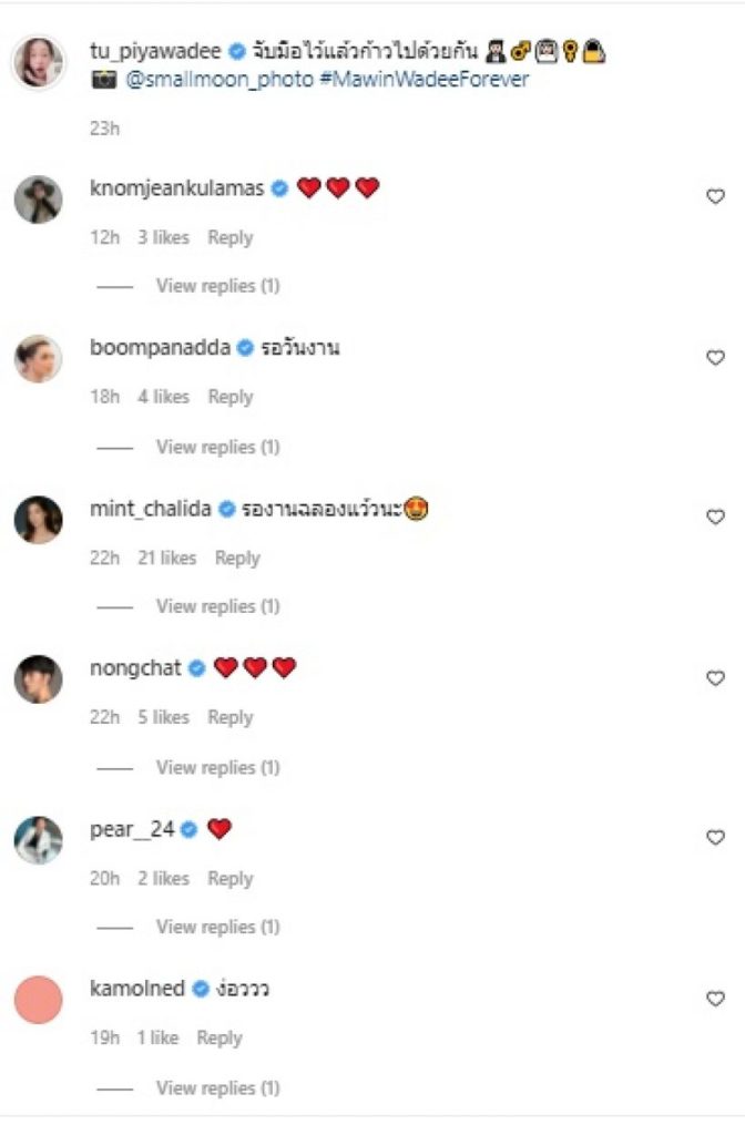 ซึ่งวานนี้ (12 ธ.ค.) ทางด้านตู่และมาวินได้ควงแขนไปจดทะเบียนสมรสเป็นสามีภรรยาอย่างเป็นทางการแล้ว ที่สำนักงานเขตบางเขน โดยทางด้านสาวตู่โพสต์ภาพพร้อมข้อความระบุว่า “จับมือไว้แล้วก้าวไปด้วยกัน” และ “หัวใจมี 3 สถานะ ของแข็ง ของเหลว และของเธอ” ในขณะที่ทางด้านมาวิน โพสต์ภาพและข้อความ “การตัดสินใจที่ถูกต้องที่สุดในชีวิตของผม ขอบคุณความกล้าในวันนั้น (ที่กล้าเข้าไปคุยกับเค้า) จึงทำให้เราสองคนมาถึงวันนี้”