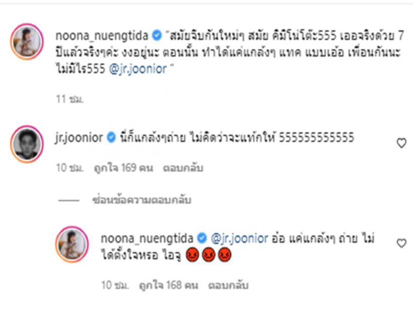 งานนี้เธอได้ออกมาโพสต์ข้อความระบุอีกว่า สมัยจีบกันใหม่ๆ สมัย คิมิโน่โต๊ะ555 เออจริงด้วย 7 ปีแล้วจริง ๆ ค่ะ งงอยู่นะ ตอนนั้น ทำได้แค่แกล้ง ๆ แทค แบบเอ้อ เพื่อนกันนะ ไม่มีไร555