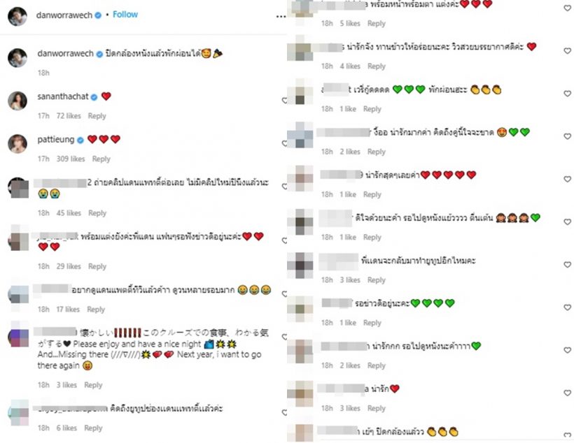 ล่าสุด “แดนและแพทตี้” ได้โพสต์ภาพครอบครัวแบบพร้อมหน้าพร้อมตา มีทั้ง “แพทตี้ คุณแม่แพทตี้ และคุณพ่อคุณแม่แพทตี้” ซึ่งเป็นวันที่พากันไปร่วมทาอาหารด้วยกันอย่างแฮปปี้ โดยระบุข้อความว่า “ปิดกล้องหนังแล้วพักผ่อนได้”