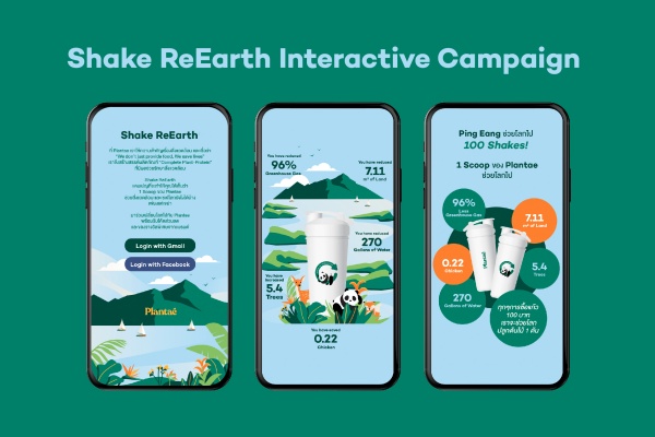 สำหรับอินเตอร์แอคทีฟ “Shake ReEarth” ที่จัดขึ้นบนเว็บไซต์ ww.plantae.co โดยหยิบเอาแก้ว Shaker มาเป็นกิมมิกในการสื่อสาร เพียงแค่เขย่าก็จะได้รับรู้ข้อมูลว่าการทานโปรตีนจากพืชของ Plantae เพียง 1 scoop คุณก็สามารถช่วยสิ่งแวดล้อมได้ ทั้งลดการใช้น้ำ 270 แกลลอน ลดการปล่อยก๊าซเรือนกระจก 96% และช่วยชีวิตไก่ 0.22 ตัว และลดการใช้พื้นที่ 7.11 ตารางเมตร ซึ่งสามารถเพิ่มพื้นที่การปลูกป่าไม้ได้ 5.4 ต้นเลยทีเดียว พร้อมส่วนลดและของรางวัลจากแบรนด์มากมาย