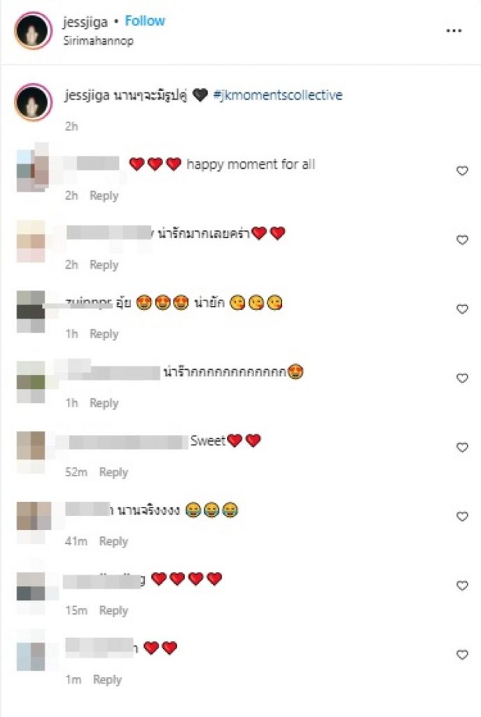 ล่าสุด “สาวเจสซี่” ได้โพสต์ภาพคู่แฟนหนุ่มนักร้องมาดเซอร์อย่าง “คริน-สาครินทร์ สุธรรมสมัย” นักร้องนำวง “ArtFLOOR” พร้อมแคปชั่น “นาน ๆ จะมีรูปคู่ #jkmomentscollective” ซึ่งตั้งแต่พวกเขาคบหาดูใจกันก็ไม่ค่อยมีภาพคู่ให้เห็นกันเท่าไหร่ แต่ถึงแม้ว่าจะไม่ใช่คู่ที่ดูจะหวือหวาแต่ก็รักกันดีมาตลอด และพวกเขาก็ได้รับฉายา คู่รักขวัญใจเด็กแนว ^_____^