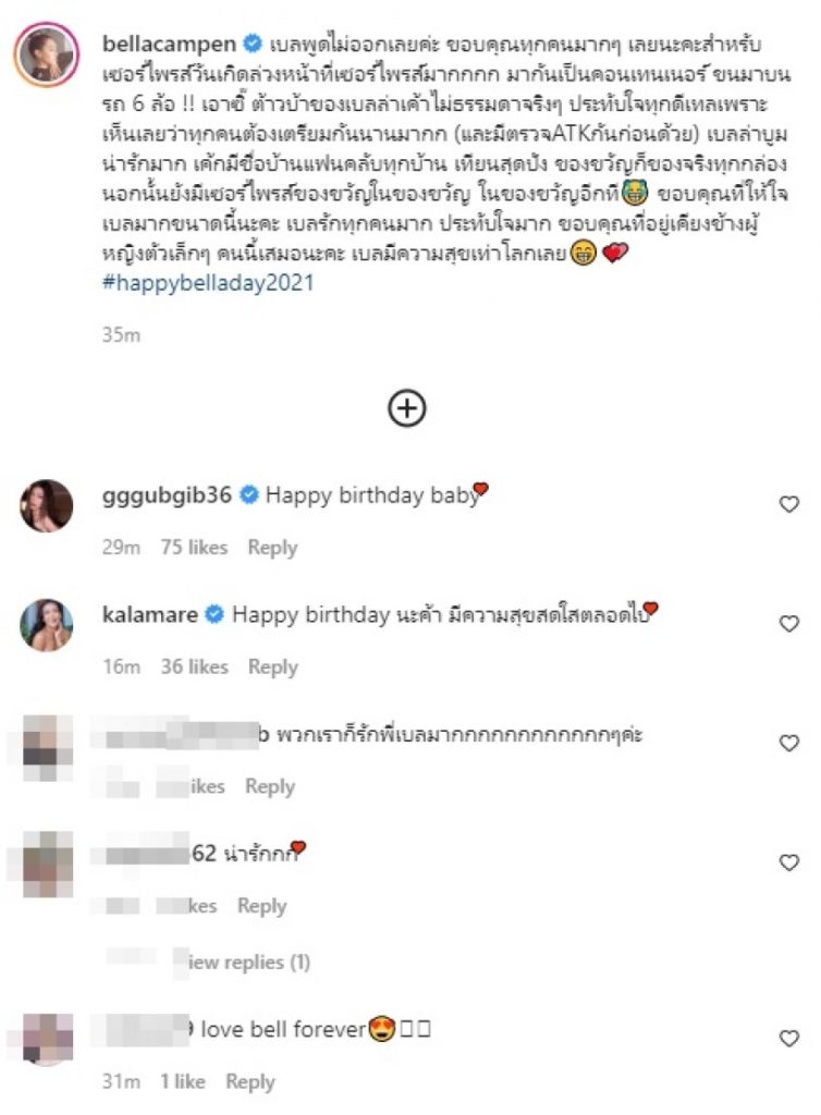 ประทับใจทุกดีเทลเพราะเห็นเลยว่าทุกคนต้องเตรียมกันนานมากก (และมีตรวจATKกันก่อนด้วย) เบลล่าบูมน่ารักมาก เค้กมีชื่อบ้านแฟนคลับทุกบ้าน เทียนสุดปัง ของขวัญก็ของจริงทุกกล่อง นอกนั้นยังมีเซอร์ไพรส์ของขวัญในของขวัญ ในของขวัญอีกที ขอบคุณที่ให้ใจเบลมากขนาดนี้นะคะ เบลรักทุกคนมาก ประทับใจมาก ขอบคุณที่อยู่เคียงข้างผู้หญิงตัวเล็กๆ คนนี้เสมอนะคะ เบลมีความสุขเท่าโลกเลย #happybelladay2021