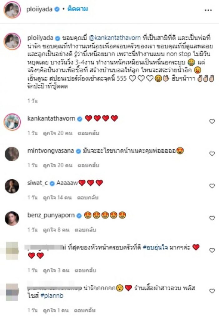 ล่าสุด “สาวพลอย” ได้โพสต์โมเมนต์น่ารักของคุณสามีที่ทักมาหาคุยกันแบบน่ารักสุด ๆ พร้อมระบุแคปชั่นว่า “ขอบคุณบี๋ @kankantathavorn ที่เป็นสามีที่ดี และเป็นพ่อที่น่ารัก ขอบคุณที่ทำงานเหนื่อยเพื่อครอบครัวของเรา ขอบคุณที่บี๋ดูแลพลอยและลูกเป็นอย่างดี รู้ว่าบี๋เหนื่อยมาก เพราะนี่ทำงานแบบ non stop ไม่มีวันหยุดเลย บางวันวิ่ง 3-4งาน ทำงานหนักเหมือนเป็นหนี้นอกระบบ แต่จริงๆคือปั่นงานเพื่อซื้อที่ สร้างบ้านบอลให้ลูก ไหนจะสระว่ายน้ำอีก เอ็นดูนะ สปอนเซอร์ต้องเข้าละจุดนี้ 555 ฮึบๆน๊าาา รักป่ะป๊าที่ซู๊ดดด”