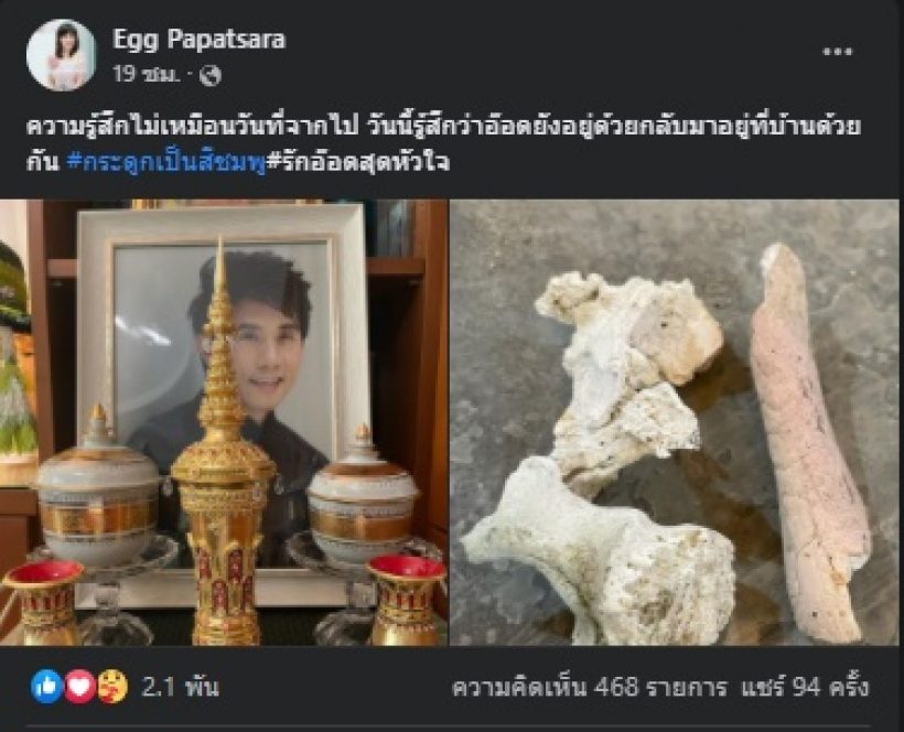 โดยทางด้านภรรยาสาว “เอ้ก ปภัสสรา” ได้โพสต์ภาพกระดูกพร้อมข้อความผ่านเฟซบุ๊ค Egg Papatsara ระบุว่า “ความรู้สึกไม่เหมือนวันที่จากไป วันนี้รู้สึกว่าอ๊อดยังอยู่ด้วยกลับมาอยู่ที่บ้านด้วยกัน #กระดูกเป็นสีชมพู#รักอ๊อดสุดหัวใจ”