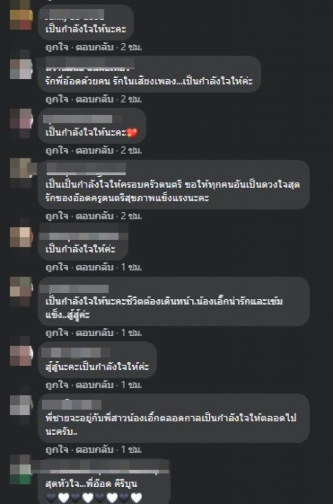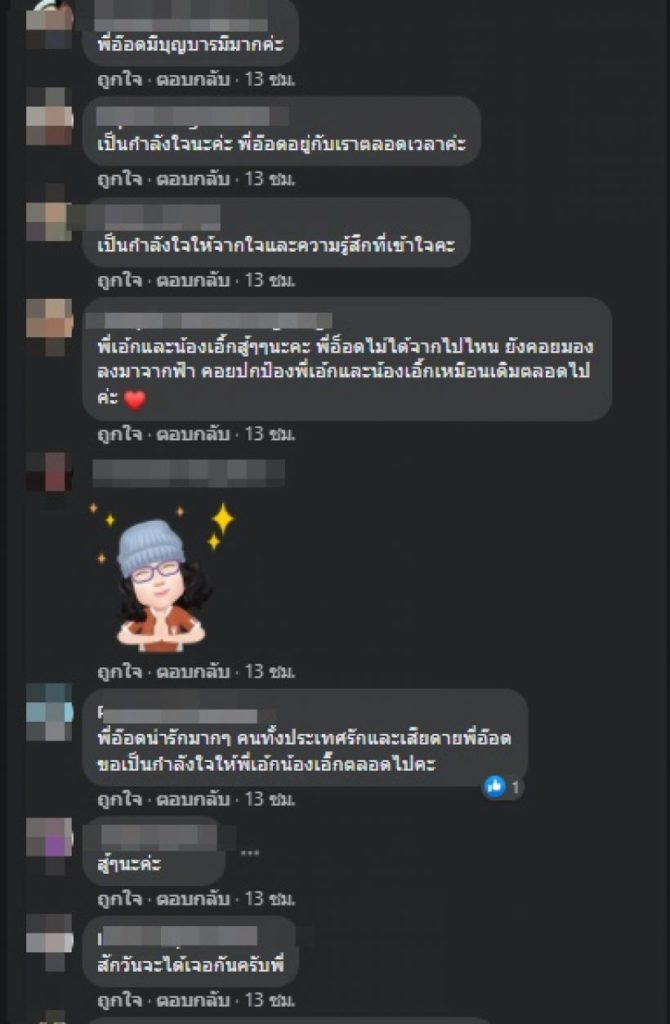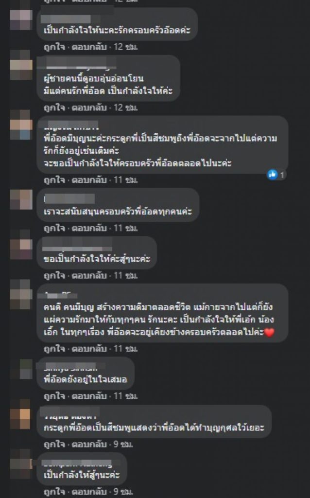 ท่ามกลางเพื่อนพี่น้องในวงการบันเทิงและแฟนคลับร่วมแสดงความเสียใจจำนวนมาก อาทิ “พี่อ๊อดมีบุญบารมีมากค่ะ , เป็นกำลังใจให้จากใจและความรู้สึกที่เข้าใจค่ะ , พี่เอ้กและน้องเอิ้กสู้ๆๆนะคะ พี่อ็อดไม่ได้จากไปไหน ยังคอยมองลงมาจากฟ้า คอยปกป้องพี่เอ้กและน้องเอิ้กเหมือนเดิมตลอดไปค่ะ , พี่อ๊อดน่ารักมากๆ คนทั้งประเทศรักและเสียดายพี่อ๊อด ขอเป็นกำลังใจให้พี่เอ้กน้องเอิ๊กตลอดไปคะ เป็นต้น”