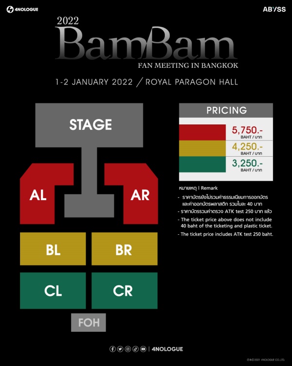 4NOLOGUE (โฟร์โนล็อค) ABYSS COMPANY และ “แบมแบม-กันต์พิมุกต์ ภูวกุล” จับมือจัดงาน 2022 BamBam FAN MEETING IN BANGKOK แฟนมีตติ้งสุดพิเศษที่จัดขึ้นเพื่อมอบเป็นของขวัญปีใหม่ 2022 ให้แฟนๆ ในประเทศไทยที่เฝ้ารอการได้พบกันอีกครั้ง หลังจากที่ไม่ได้พบกันอย่างยาวนานเพราะสถานการณ์ COVID-19 งานนี้หนุ่มแบมแบมถือโอกาสช่วงกลับไทยเป็นครั้งแรกหลังจากที่ไม่ได้กลับบ้านเกือบ 2 ปี ขอชดเชยเวลาในช่วงที่ต้องห่างกัน แฟน ๆ เตรียมตัวให้พร้อมรับความพิเศษที่จะเกิดขึ้นอย่างเต็มอิ่ม ในวันที่ 1 และ 2 มกราคม 2565 ณ รอยัล พารากอน ฮอลล์ ชั้น 5 ศูนย์การค้าสยามพารากอน