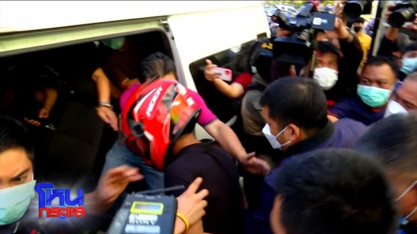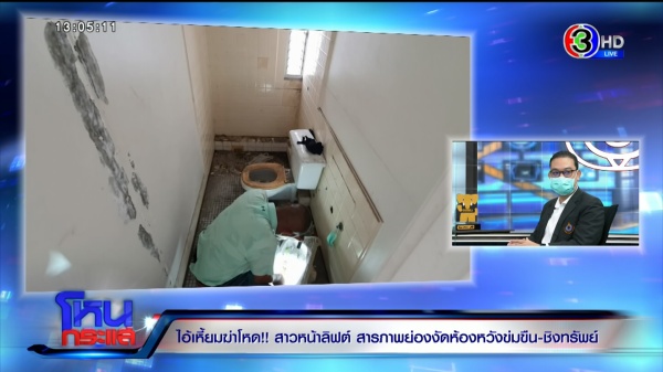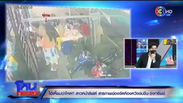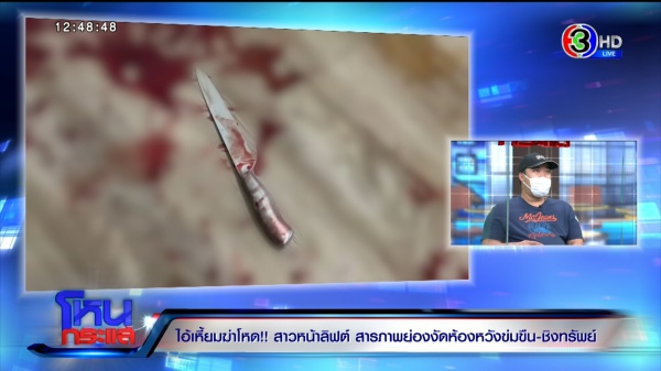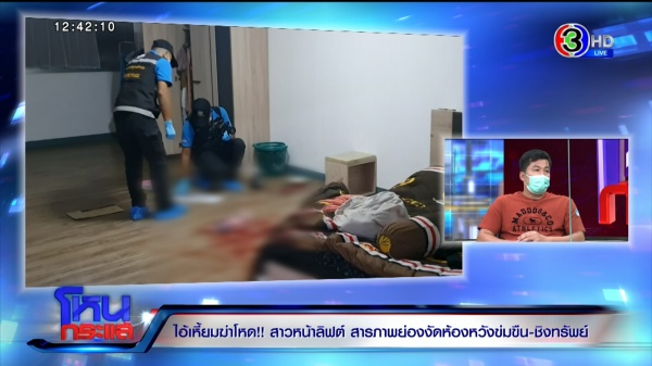 (มีภาพสดเข้ามา “คุณโบ๊ต” ผู้สื่อข่าวรายงานว่าคุมตัวคนร้ายไปทำแผนประกอบคำรับสารภาพ ที่ชั้น 7 คอนโดที่เกิดเหตุ จากการสอบปากคำชัดเจนว่าผู้ก่อเหตุประสงค์ต่อทรัพย์ ยังไม่ยืนยันว่ามีความประสงค์เรื่องทางเพศหรือก่อเหตุข่มขืนแต่อย่างใด การจับกุมในครั้งนี้ สืบเนื่องจากหลักฐานทางนิติวิทยาศาสตร์ มีการเอาเสื้อไปเปลี่ยนที่ห้องร้างที่ชั้น 5 ในวันเกิดเหตุ ผู้ต้องหาไปดื่มเบียร์ที่ชั้น 7 และเห็นผู้ตายออกมาจากห้องโดยไม่ได้ล็อก ลงมาเอาของที่สั่งเดลิเวอรี่เอาไว้ ตนเองเห็นจังหวะเลยเข้าไปหวังขโมยทรัพย์สิน แต่ตัวผู้ตายเข้ามา เลยทำให้มีการต่อสู้กัน และใช้อาวุธมีดที่พกเป็นนิสัยอยู่แล้ว แทงไปบริเวณต้นขาด้านซ้าย ซึ่งเป็นจุดเส้นเลือดใหญ่ ทำให้ผู้ตายเสียชีวิต นี่คือคำรับสารภาพเบื้องต้นของทางผู้ต้องหา ล่าสุดมีการเตรียมคุมตัวผู้ต้องหาลงมาขึ้นรถตู้เจ้าหน้าที่ตร. เพื่อพาไปตรวจร่างกายที่รพ. ชาวบ้านค่อนข้างหวาดกลัวกับเหตุการณ์ครั้งนี้ โดยตัวผู้ก่อเหตุยอมรับว่าเวลาดื่มเบียร์เสร็จก็ไปเปิดปิดตามห้องต่างๆ และโดนเจ้าของห้องต่อว่าหลายครั้ง แต่ไม่มีการแจ้งความดำเนินคดีแต่อย่างใด)