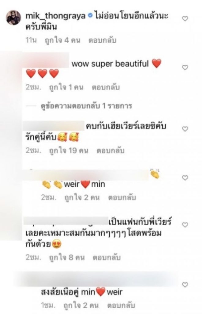 งานนี้ก็ทำเอาบรรดาเเฟนคลับเข้ามาคอมเมนต์เเนะนำให้ “มิน พีชญา” คบกับ “เวียร์” ซึ่งคู่นี้เคยเล่นละครด้วยกันทางช่อง 7 มาก่อนนั่นเองค่ะ เเต่ก็จิ้นอย่างมีขอบเขตนะคะเพราะก่อนหน้านี้ที่เวียร์ให้สัมภาษณ์เจ้าตัวนั้นมีคุยสาวนอกวงการเเล้วนั่นเองค่ะ