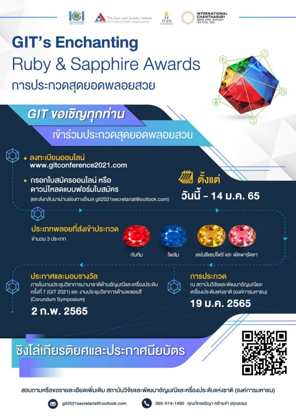 GIT เดินหน้าจัดประกวดสุดยอดพลอยสวยจากทุกมุมโลก “GIT’s Enchanting Ruby & Sapphire Awards” เปิดรับผู้สมัคร ตั้งแต่วันนี้ – 14 มกราคม 2565 ตอกย้ำภาพลักษณ์ประเทศไทยศูนย์กลางการผลิตและการค้าเครื่องประดับที่สำคัญของโลก
