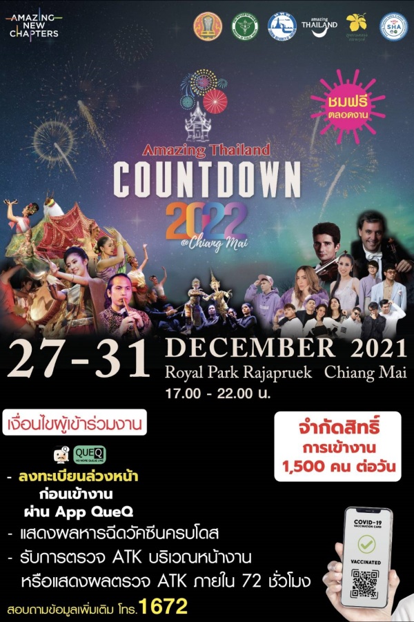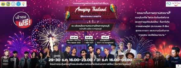 โดยงานส่งท้ายปีเก่า ต้อนรับปีใหม่ 2565 ครั้งนี้ ประกอบไปด้วยการจุดพลุ การออกร้านขายของ กิจกรรมดนตรีพื้นบ้าน และคอนเสิร์ตจากศิลปินทั่วฟ้าเมืองไทย ซึ่งปีนี้ค่ายข้าวสารเอ็นเตอร์เทนเม้นท์ ได้ส่งศิลปินร่วมคอนเสิร์ตCountdown 2022 มากมาย อาทิ ACT ART ร่วมเล่นคอนเสิร์ตณ อุทยานหลวงราชพฤกษ์ (หอคำหลวง) จังหวัดเชียงใหม่พร้อมชมกิจกรรมไฮไลท์ การจุดพลุ 9 ชุด ได้แก่ ความสุข ความหวัง ศรัทธา กำลังใจ การเริ่มต้นใหม่ที่งดงามและยิ่งใหญ่ ความรุ่งเรือง สุขภาพแข็งแรงทั้งกาย และใจ ความสำเร็จ และเอกลักษณ์ความเป็นล้านนา การตกแต่งประดับไฟในรูปแบบสวนแสงในอุทยานหลวง ราชพฤกษ์ที่ยิ่งใหญ่อลังการ พบกับแสงเหนือในการเปิดศักราชเข้าสู่ปีใหม่ ชมการแสดง Lanna Symphony Orchestra ร่วมกับศิลปินพื้นบ้านล้านนา และการแสดงดนตรีจากศิลปินทั่วฟ้าเมืองไทย ฟลุ๊ค ไอน้ำ, 7Days Crazy และS.D.F ร่วมคอนเสิร์ต Amazing Thailand Countdown 2022 @Kanjanaburi แสงสุดท้าย เก็บภาพความงามของอุโมงค์ไฟ ไฟประดับต้นคริสมาสต์ จุดถ่ายรูปต้อนรับปีใหม่ ตื่นตาไปกับการแสดงพลุไฟ ตื่นตากับแสง สี เสียง สุดตระการตา และความบันเทิงจากศิลปินมากมาย