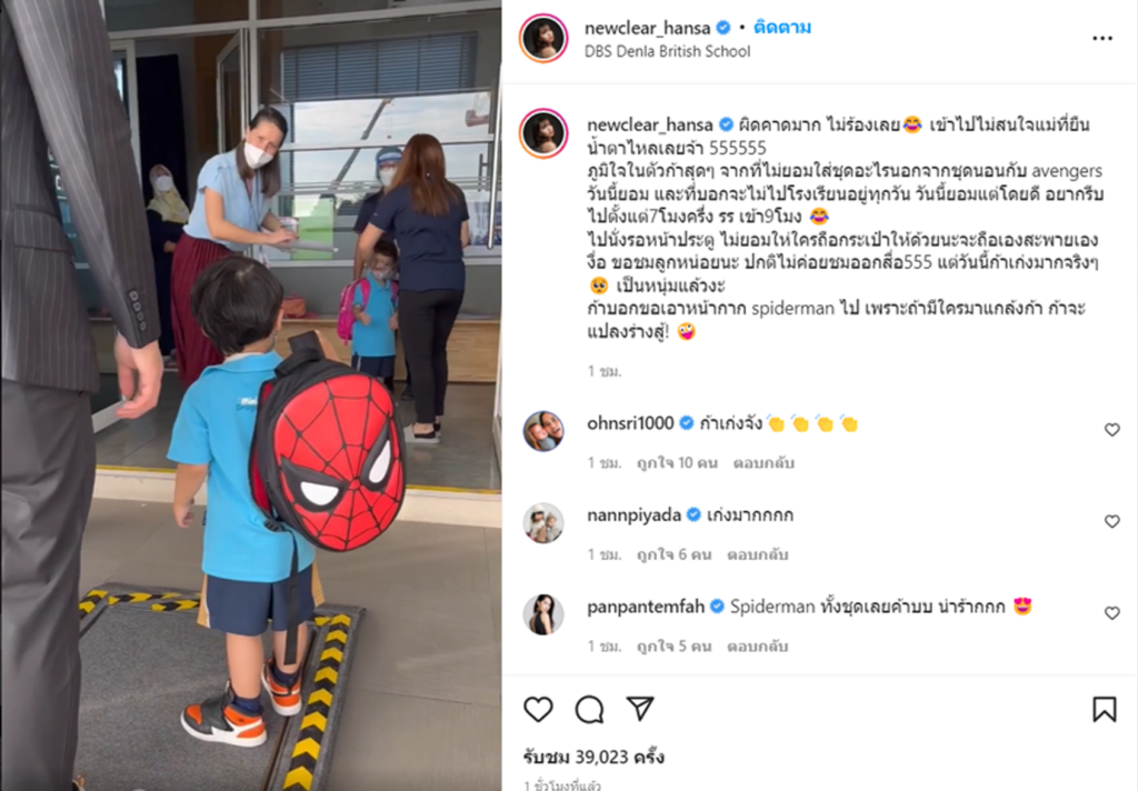 พร้อมโพสต์รูปกับแคปชั่น รีวิววันแรกว่า” ไปโรงเรียนวันแรก!!! ใครตื่นเต้น ไม่มี้ แค่มารอตั้งแต่โรงเรียนยังไม่เปิด เดวไว้จะมาเล่าให้ฟังนะฮะ แต่ช่วงเช้ายังดีอยู่ อยากมาโรงเรียนมาก ยอมใส่ชุดด้วย แต่ขอเอาหน้ากาก spiderman ไปด้วย เผื่อแปลงร่าง”