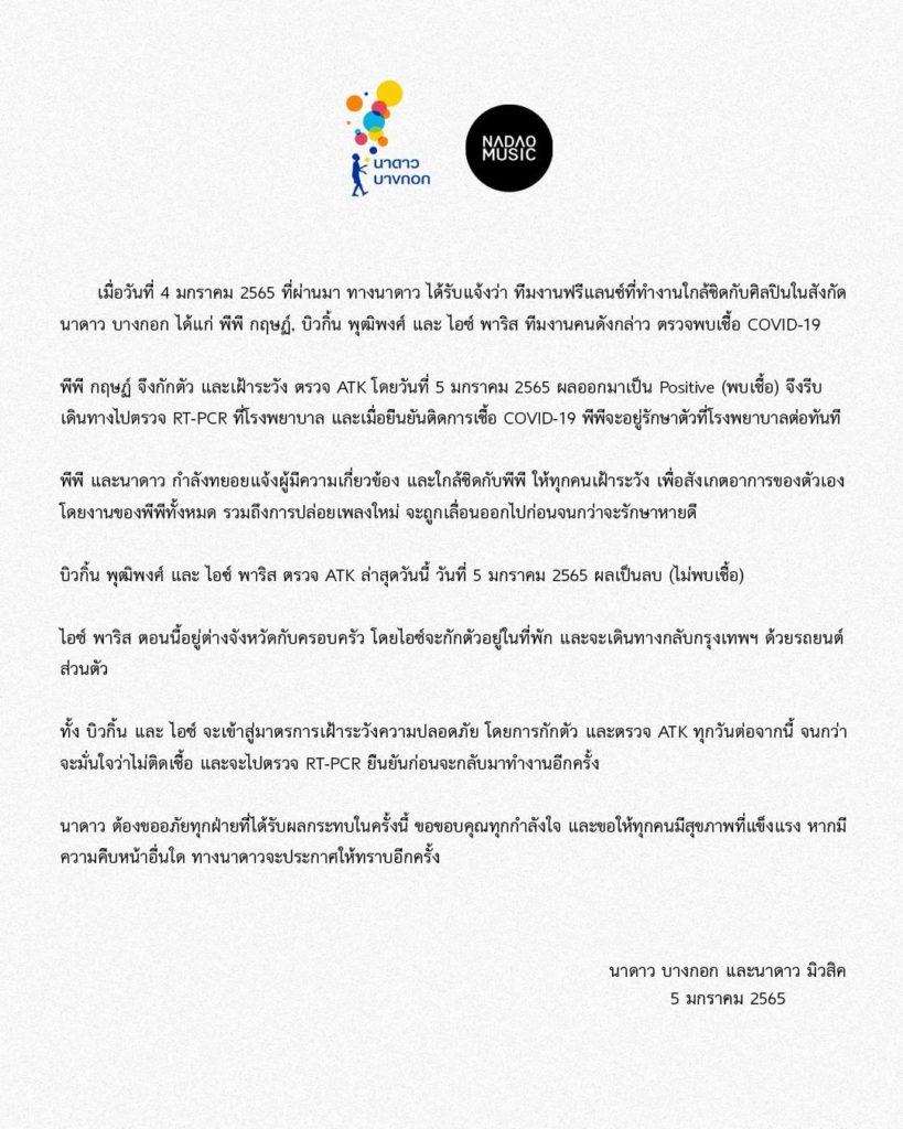 ค่ายนาดาว ต้นสังกัดได้แจ้งประกาศอย่างเป็นทางการผ่านทางไอจี : nadaobangkok “พีพี กฤษฏ์” ติดโควิด-19 “บิวกิ้น” -“ไอซ์ พาริส” ผลเป็นลบเข้ากักตัวแล้ว โดยระบุข้อความไว้ว่า