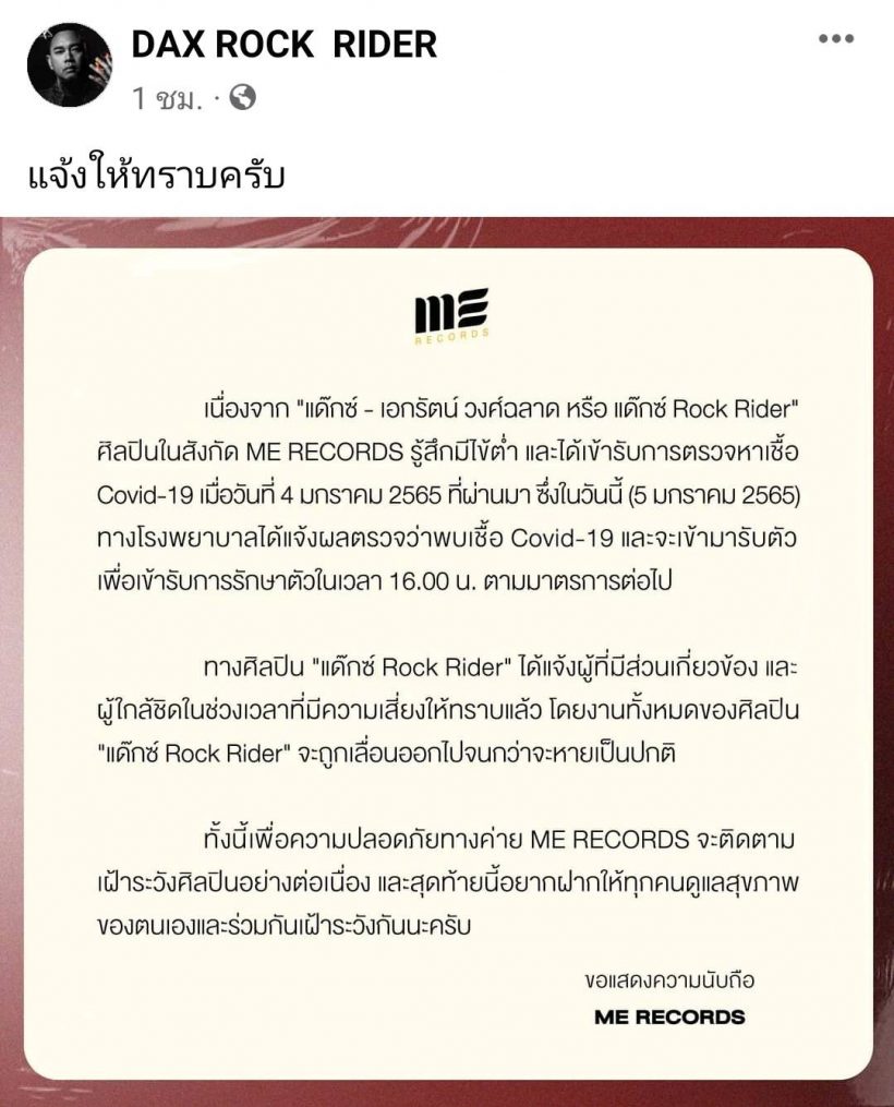 โดยทางด้านต้นสังกัด ME RECORDS ได้ร่อนจดหมายโดยมีข้อความระบุไว้ว่า “เนื่องจาก “แด๊กซ์-เอกรัตน์ วงศ์ฉลาด หรือ แด๊กซ์ Rock Rider” ศิลปินในสังกัด ME RECORDS รู้สึกมีไข้ต่ำ และได้เข้ารับการตรวจหาเชื้อ Covid-19 เมื่อวันที่ 4 มกราคม 2565 ที่ผ่านมา ซึ่งในวันนี้ (5 มกราคม 2565) ทางโรงพยาบาลได้แจ้งผลตรวจว่าพบเชื้อ Covid-19 และจะเข้ามารับตัวเพื่อเข้ารับการรักษาตัวในเวลา 16.00 น. ตามมาตรการต่อไป