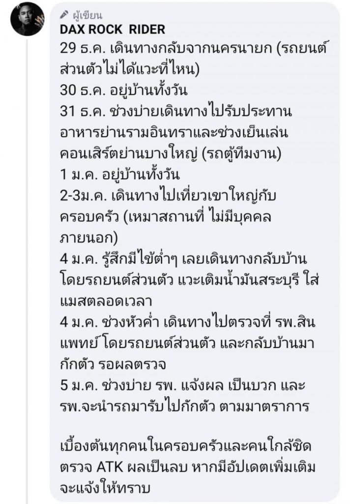 ทั้งนี้ แด๊กซ์ Rock Rider ก็ได้แจงไทม์ไลน์ย้อนหลังให้คนใกล้ชิดที่มีความเสี่ยงได้ทราบและไปตรวจหาเชื้อทันที