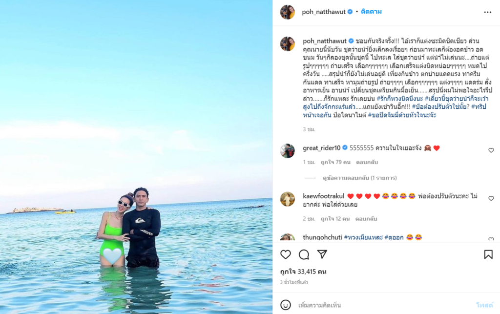 แม่เอ๋ จัดวันพีชเว้าสูงสีเขียว และได้แชะภาพคู่กับป๋อ แต่งานนี้เว้าสูงเซ็กซี่เกินต้านจนพ่อป๋อของเราหวงหนักมากถึงขั้นเอาสติ๊กเกอร์มาแปะปิดทับ โพสต์ภาพนี้พร้อมบอกว่า “ชอบกันจริงจริ๊ง!!! ไอ้เราก็แต่งซะมิดชิดเชียว ส่วนคุณนายนี้นับวัน ชุดว่ายนำ้ยิ่งเล็กลงเรื่อย ๆ ก่อนมาทะเลก็ต้องอดข้าว อดขนม วันๆก็ลองชุดนั้นชุดนี้ ไปทะเล ใส่ชุดว่ายนำ้ แต่นำ้ไม่เล่นนะ….ถ่ายแต่รูปๆๆๆๆๆๆ ถ่ายเสร็จ เลือกๆๆๆๆๆๆ เลือกเสร็จแต่งนิดหน่อยๆๆๆๆๆ หมดไปครึ่งวัน …..สรุปนำ้ก็ยังไม่เล่นอยู่ดี เที่ยงกินข้าว ตกบ่ายแดดแรง ทาครีมกันแดด ทาเสร็จ หามุมถ่ายรูป ถ่ายๆๆๆๆ เลือกๆๆๆๆๆๆ แต่งๆๆๆๆ แดดร่ม สั่งอาหารเย็น อาบนำ้ เปลี่ยนชุดเตรียมกินมื้อเย็น…….สรุปนี่ผมไม่พอใจอะไรรึปล่าว…….ก็รักแหละ รักเลยบ่น #รักก็หวงนิดนึงนะ #เดี๋ยวนี้ชุดว่ายนำ้ก็จะเว้าสูงไปถึงจักกะแร้แล้ว…..แถมยังเข้าวินอี๊ก!!! #ป๋อต้องปรับตัวใช่มั้ย? #ทริปหน้าเจอกัน ป๋อไดนาไมต์ #ขอปิดจิมมี่ด้วยหัวใจนะจ๊ะ”