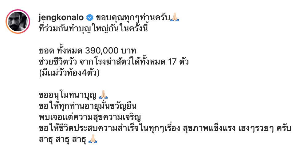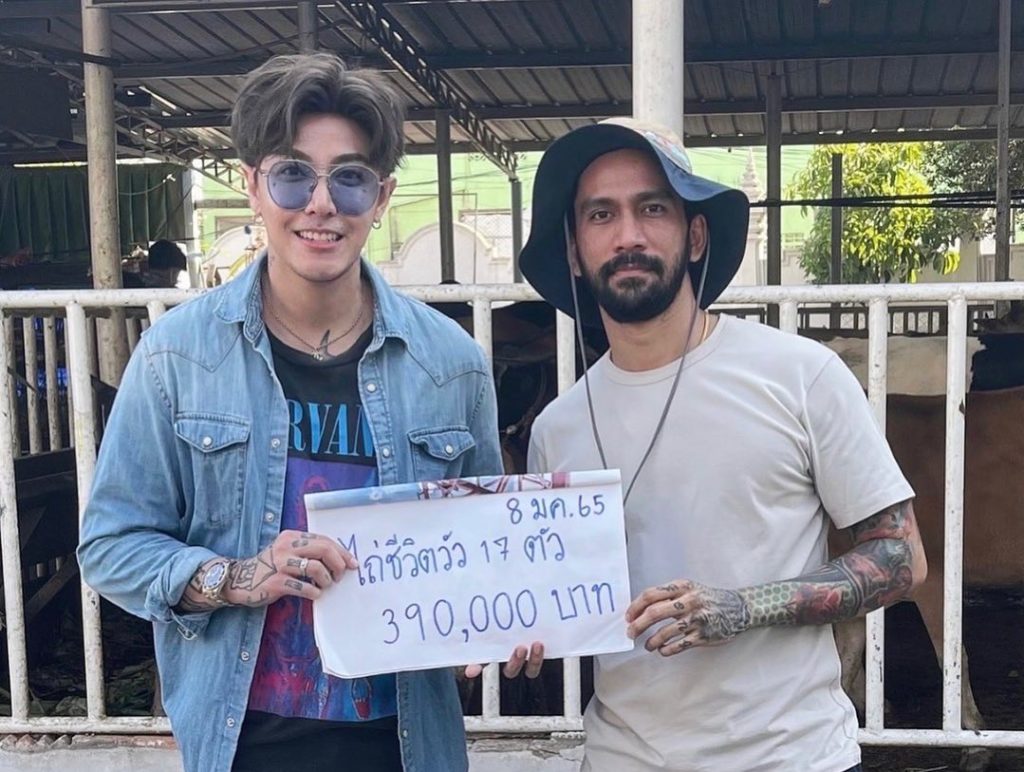 ที่ล่าสุดสองหนุ่ม แท็กทีมสร้างบุญ ร่วมกัน กับการไถ่ชีวิต โคกระบือ ด้วยจำนวนเงินกว่า 390,000 บาท โดยหนุ่มเจ๋งได้ลงเรื่องราวผ่านไอจีส่วนตัว โดยระบุข้อความไว้ว่า