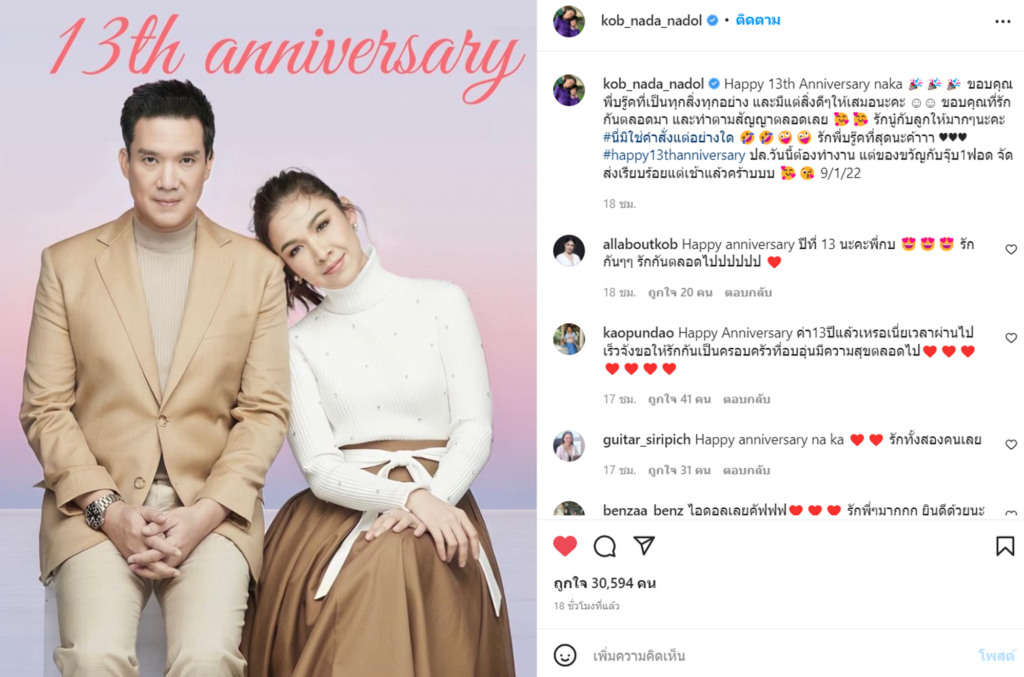 นานทีปีหนจะโชว์ความหวานสักหน สำหรับนางเอกตลอดกาล กบ สุวนันท์ ที่ล่าสุดโพสต์ซึ้งเผยความรู้สึกถึงสามีคู่ชีวิต บรู๊ค ดนุพร เนื่องในวันครบรอบแต่งงาน 13 ปี