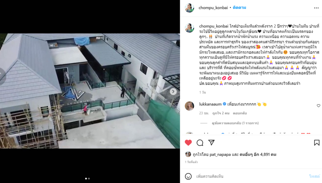 ล่าสุด ชมพู่ ได้เผยภาพบ้านในฝันของตัวเองที่ตอนนี้จะสร้างเสร็จสมบูรณ์ 100% แล้ว โดยโพสต์ภาพบ้านผ่านอินสตราแกรม @chompu_konbai พร้อมเผยความในใจว่า “ใกล้ย้ายเต็มทีแล้วหลังจาก 2 ปีกว่าๆ บ้านในฝัน บ้านที่จะใช้ชีวิตอยู่ดูลูกหลานในวัยเกษียณ บ้านที่อนาคตก็จะเป็นมรดกของลูกๆ.. บ้านที่เกิดจากน้ำพักน้ำแรง ความเหนื่อย ความอดทน ความประหยัด และการทำธุรกิจ ของเราสองคนสามีภรรยา ร่วมด้วยช่วยกันค่อยๆสานฝันของครอบครัวเราให้สมบูรณ์ เวลาเข้าไปดูน้ำตาแห่งความภูมิใจมักจะไหลเสมอ..และเรามักจะกอดและให้กำลังใจกัน