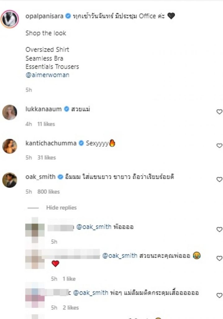 ล่าสุดมาในเสื้อครึ่งตัวแหวกอกลึก โชว์เอวเอสและกล้ามท้องปัง ๆ พร้อมแคปชั่น “ทุกเช้าวันจันทร์ มีประชุม Office ค่ะ” แต่งานนี้หมอโอ๊คอดหวงไม่ได้เลยเข้ามาคอมเมนต์ “อืมมม ใส่แขนยาว ขายาว ถือว่าเรียบร้อยดี” เป็นประโยคที่ไม่มีคำว่าหวงแต่อ่านแล้วรู้เลยว่าหวงมาก อิอิ 😀