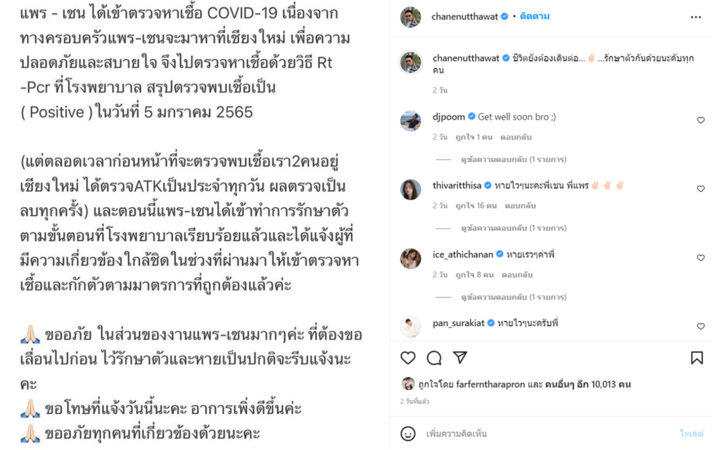 เชนบอกว่า เท่าที่คุยกับคุณหมอก็ด้วยอาการของทั้งคู่ก็ค่อนข้างไปทางโอมิครอน ซึ่งตอนนี้โอมิครอน เป็นเชื้อที่แพร่กระจายเยอะที่สุด ณ เวลานี้ ตอนนี้ทั้งคู่ได้เอ็กซ์เรย์ปอดไป 2 ครั้งแล้ว ยังไม่มีเชื้อลงปอด คาดว่าจะได้ออกจากโรงพยาบาลในวันที่ 14 – 15 ม.ค. นี้ แต่จะต้องรอดูอาการก่อน