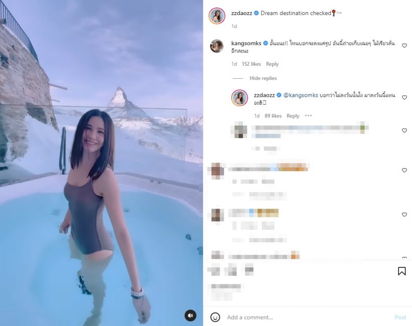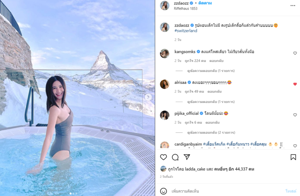 ล่าสุด ดีเจดาว ได้โพสต์ภาพแซ่บ ๆ อวดวิว อวดหุ่นสวยๆ ชุดว่ายน้ำตัวจิ๋วอวดผิวขาวออร่า ท้าอากาศหนาวท่ามกลางหิมะขาวโพลน พร้อมแคปชั่น ‘รูปตอนเด็กไม่มี ลงรูปเด็กดื้อก็แล้วกันค้าบบบบบ #switzerland’ แต่งานนี้ทำเอาแฟนหนุ่มไม่ปลื้มอย่างแรง คอมเมนต์ทันทีว่า ‘ลงแค่โพสเดียว ไม้เรียวสั่นทั้งมือ‘