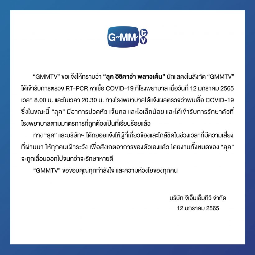 GMMTV ต้นสังกัดของพระเอกลูกครึ่ง ลุค อิชิคาว่า พลาวเด้น ล่าสุดติดเชื้อโควิด-19 โดยทราบผลตรวจว่าติดเชื้อเมื่อวันที่ 12 มกราคม ที่ผ่านมา โดยอาการล่าสุดของหนุ่มลุคตอนนี้ มีอาการปวดหัว เจ็บคอ และ ไอเล็กน้อย และเข้ารับการรักษาตัวที่โรงพยาบาลตามมาตรการที่ถูกต้องเป็นที่เรียบร้อยแล้ว