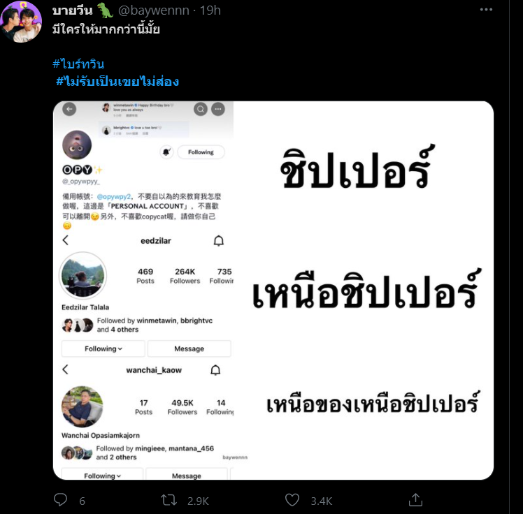 #ไม่รับเป็นเขยไม่ส่อง กลายเป็นแฮชแท็กที่มาแรง ที่ล่าสุดกระโดดขึ้นอันดับ 1 เทรนด์ทวิตเตอร์ของไทยไปเรียบร้อยแล้ว ซึ่งที่มาของแฮชแท็กนี้ก็บอกเลยว่าชาวด้อม “ไบร์ทวิน” มีฟินสลบนะจ๊ะ เหตุเกิดจากแฟน ๆ ไปสังเกตุกันมาได้ว่า คุณพ่อ “วันชัย โอภาสเอี่ยมขจร” คุณพ่อของหนุ่ม “วิน เมธวิน” ได้ตามกดไลค์รูปของหนุ่ม “ไบร์ท วชิรวิชญ์” คู่จิ้นของลูกชายแทบทุกรูป แถมมีไล่ย้อนกลับไปไลก์จนถึงภาพเมื่อปี 2555 ก่อนที่ไบร์ทวิน จะจับคู่โด่งดังสุดกู่ใน คั่นกูเพราะเราคู่กัน กลายเป็นคู่จิ้นขวัญใจสาววายทั่วโลกซะอีก