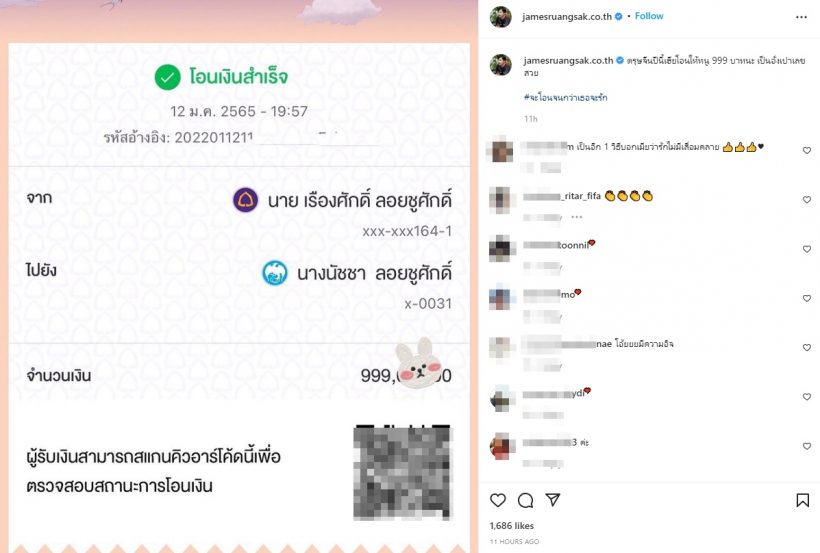 เจมส์ เรืองศักดิ์ ลอยชูศักดิ์ ล่าสุดโอนเงินให้คุณภรรยาคนสวย “ครูก้อย” จำนวนหลายแสนบาท เป็นอั่งเปาเล็ก ๆ น้อย ๆ พร้อมแคปชั่นว่า “ตรุษจีนปีนี้เฮียโอนให้หนู 999 บาทนะ เป็นอั่งเปาเลขสวย #จะโอนจนกว่าเธอจะรัก” ด้านครูก้อย ก็ได้เข้ามาคอมเมนต์ด้วยความตื่นเต้นดีใจว่า ‘ว๊ายยย เพิ่งเห็น @jamesruangsak.co.th รักตั้งนานแล้วน้าาาา เฮีย“