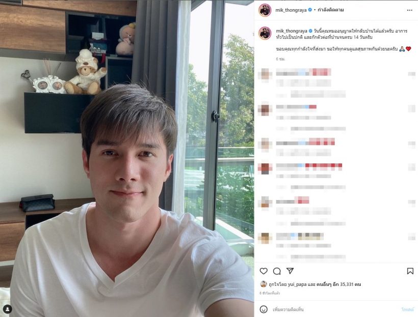 โดยหนุ่มมิกค์โพสต์ภาพยิ้มแย้ม พร้อมแคปชั่นว่า “วันนี้คุณหมออนุญาตให้กลับบ้านได้แล้วครับ อาการทั่วไปเป็นปกติ และกักตัวต่อที่บ้านจนครบ 14 วันครับ ขอบคุณทุกกำลังใจที่ส่งมา ขอให้ทุกคนดูแลสุขภาพกันด้วยนะครับ” ^_________^