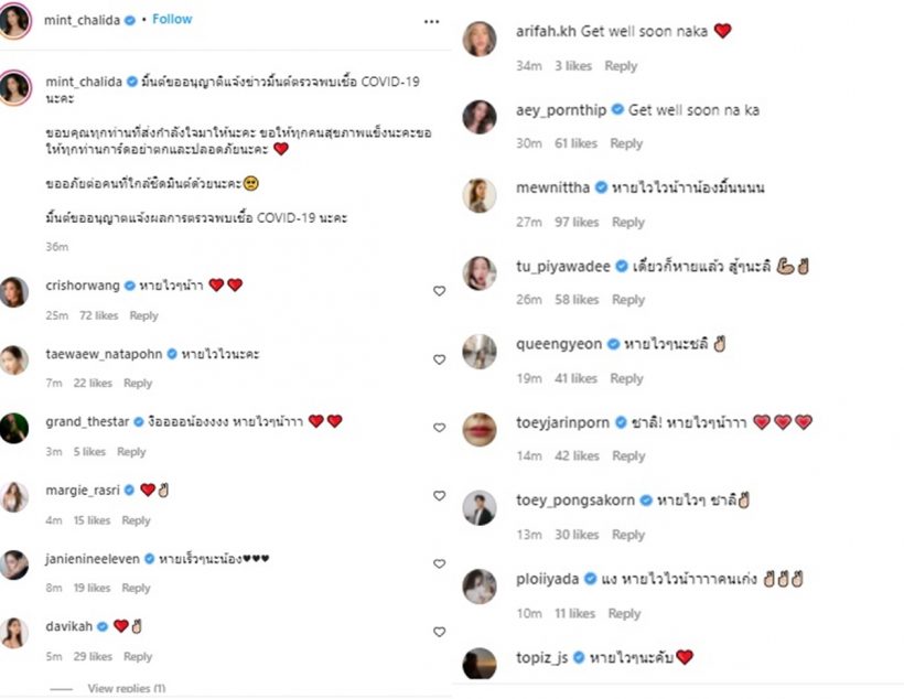 “มิ้นต์-ชาลิดา วิจิตรวงศ์ทอง” ได้โพสต์อินสตราแกรม @mint_chalida แจ้งติดเชื้อโควิด-19