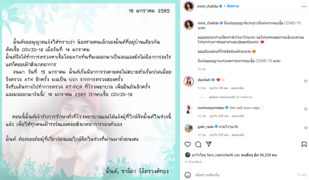 พร้อมบอกว่า น้องชายคนเล็กของมิ้นต์ที่อยู่บ้านเดียวกันติดเชื้อโควิด-19 เมื่อวันที่ 14 มกราคม ที่ผ่านมา ทางด้านมิ้นต์ตรวจหาเชื้อโดย ATK ผลออกมาเป็นลบและไม่มีอาการใด ๆ จนกระทั่งวันที่ 15 มกราคม มิ้นต์เริ่มมีอาการระคายคอ ไม่สบายตัว ปวกเมื่อย ตรวจ ATK อีกครั้งผลเป็นบวก จึงไปตรวจที่โรงพยาบาล สุดท้ายผลออกมาวันนี้ 16 มกราคม ติดเชื้อโควิด ตอนนี้ได้เข้ารับการรักษาที่โรงพยาบาลแล้ว