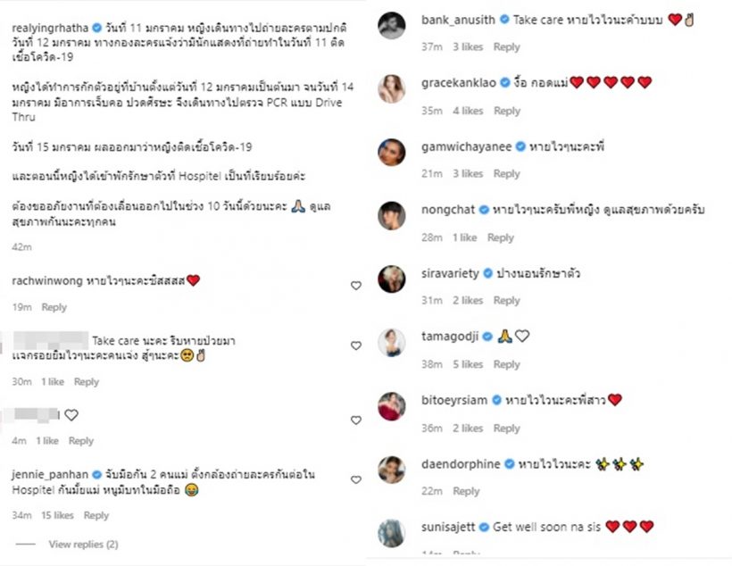 วันที่ 15 มกราคม ผลออกมาว่าหญิงติดเชื้อโควิด-19 และตอนนี้หญิงได้เข้าพักรักษาตัวที่ Hospitel เป็นที่เรียบร้อยค่ะ ต้องขออภัยงานที่ต้องเลื่อนออกไปในช่วง 10 วันนี้ด้วยนะคะ ดูแลสุขภาพกันนะคะทุกคน”