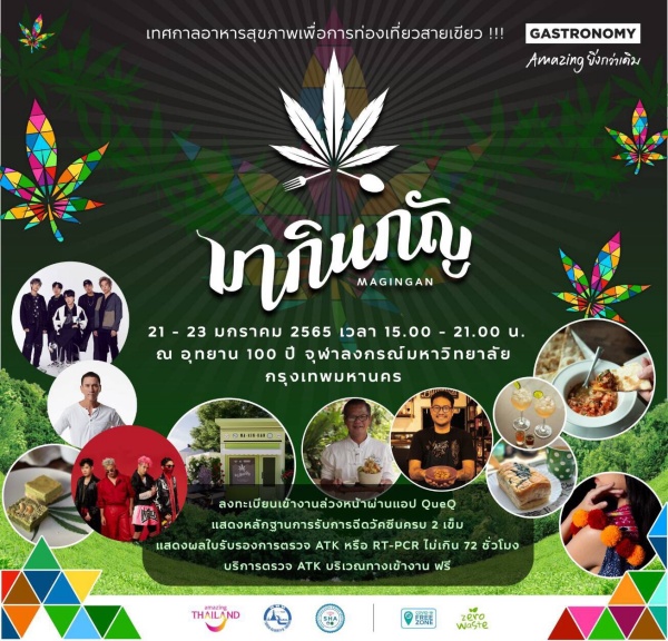 ครั้งแรกของสายเขียว!! กับเทศกาลอาหารสุขภาพและการท่องเที่ยวเทรนด์กัญชา-กัญชง ในกิจกรรม “มากินกัญ” ภายใต้โครงการ Gartronomy Amazing ยิ่งกว่าเดิม ระหว่างวันที่ 21-23 มกราคม 2565 เวลา 15.00-21.00 น. ณ อุทยาน 100 ปี ถนนบรรทัดทอง เขตปทุมวัน