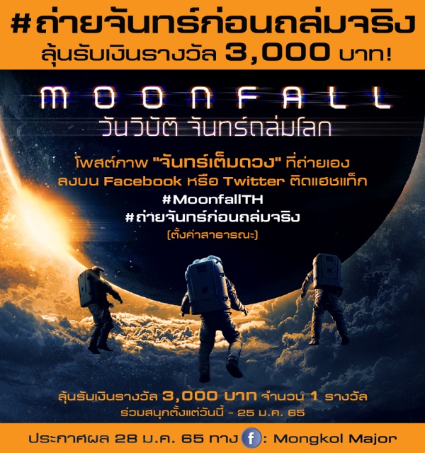 “มงคลเมเจอร์” ร่วมกับ “ Moonfall วันวิบัติจันทร์ถล่มโลก” ผลงานภาพยนตร์แอ็กชัน-มหันตภัยแห่งปี ขอชวนชาวไทยร่วมกิจกรรมสร้างสรรค์ ไอเดียโดน ๆ ภายใต้คอนเซปต์ “No More Full Moon!” กับจันทร์เต็มดวงครั้งสุดท้าย ก่อนที่ดวงจันทร์จะพุ่งชนโลก เพียงแค่ถ่ายหรือโพส “ภาพดวงจันทร์ในสไตล์ของคุณ” ลงบนช่องทางโซเชียลไม่ว่าจะเป็น เฟซบุ๊ก หรือ ทวิตเตอร์ โดยตั้งค่าเป็นสาธารณะ พร้อมติดแฮชแท็ก #ถ่ายจันทร์ก่อนถล่มจริง และ #MOONFALLTH เพื่อลุ้นรับเงินรางวัล 3,000 บาท จำนวน 1 รางวัล ผู้สนใจสามารถร่วมสนุกได้ตั้งแต่วันนี้ – วันที่ 23 มกราคม 2565 ประกาศผลผู้โชคดีวันที่ 28 มกราคม 2565 ทางเฟซบุ๊กมงคลเมเจอร์
