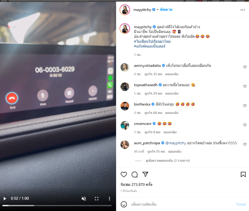โดย สาวเมย์ ได้เผยนาทีปะทะฝีปากกับมิจฉาชีพรายหนึ่งแอบอ้างโทรหาเรื่องพัสดุ คุยกันไปสักพักคนร้ายเริ่มรู้ตัว และฝากคำพูดทิ้งท้ายไว้อย่างเจ็บแสบ โดยสาวเมย์โพสต์ว่า “อุตส่าห์ดีใจได้เจอกับเค้าบ้าง มิจฉาชีพ ไม่เป็นมิตรเลอ ปล.คำสุดท้ายเค้าพูดว่าไรนะคะ ฟังไม่ชัด #ไม่เนียนไปเรียนมาใหม่ #แก๊งค์คอลเซ็นเตอร์“