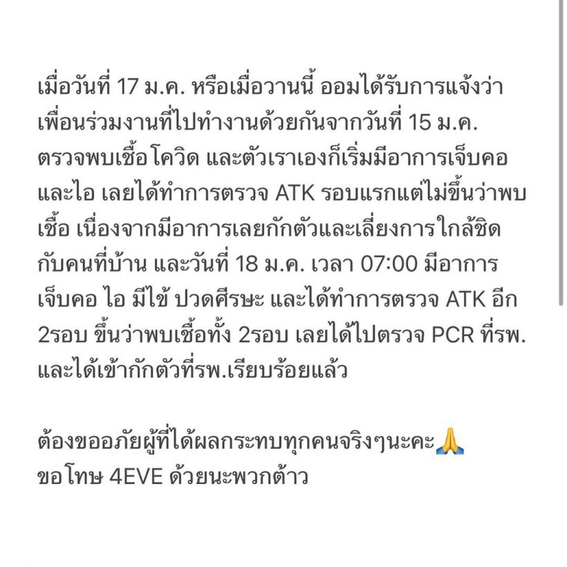 ตามมาติด ๆ เพื่อนร่วมวงอย่าง ตาออม 4EVE ได้ออกมาอัพเดทว่าตนเองติดโควิดเช่นกันและมีอาการเหมือนของสาวอ๊ะอาย เลยก่อนตรวจพบว่าติดเชื้อและกำลังรักษาตัว
