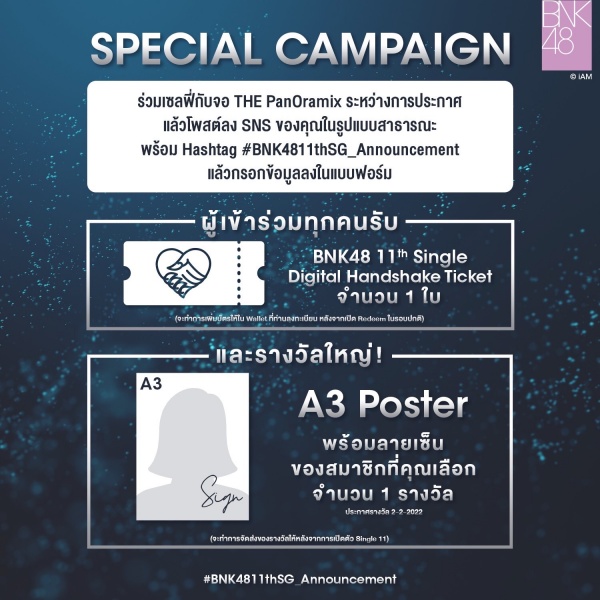 แฟนแฟนจะได้ร่วมลุ้นของรางวัลพิเศษ โดยสามารถร่วมถ่ายเซลฟี่กับจอ THE PanOramix ระหว่างการประกาศเซ็มบัตสึแล้วโพสต์ลง SNS ของคุณในรูปแบบสาธารณะ พร้อม Hashtag #BNK4811thSG_Announcement พร้อมเขียนแคปภาพที่โพสแล้วกรอกข้อมูลลงในแบบฟอร์ม ทั้งนี้ผู้เข้าร่วมกิจกรรมทุกคนรับ BNK48 11th Single Digital Handshake Ticket จำนวน 1 ใบ (จำกัดจำนวน 1 ใบต่อท่าน) ทั้งนี้บัตรจะถูกส่งให้ทาง Wallet ที่ท่านลงทะเบียน ภายหลังจากเปิด Redeem บัตรของ Single 11 และลุ้นเป็นผู้โชคดีรับรูป Poster ขนาด A3 พร้อมลายเซ็น ของสมาชิกที่คุณเลือก จำนวน 1 รางวัลของรางวัลจะถูกส่งให้ หลังจากเปิดตัว Single 11 ต่อไป