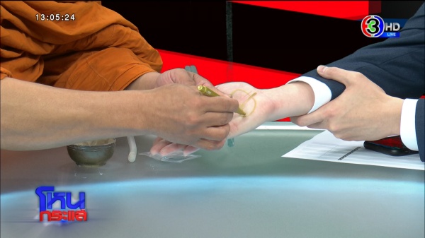 พระครูวสมุห์นพดล : อุปกรณ์แบบนี้พระทุกรูปก็น่าจะมี ไม่ได้นอกเหนือจากพระหลายรูปมี วิธีการจริง ๆ ตอนลูกศิษย์มาขอครั้งแรก เราไม่รู้จักนะหรอกนะ แต่เขาบอกว่านะหน้าทองต้องมีแผ่นทอง เขาเตรียมมาให้ เหลือจากการทำบุญบ้าน เราก็จิ้มเหมือนเวลาเจิมบ้าน จิ้มไปที่แผ่นทอง ไม่ได้ทำอะไรเลย จิ้มไปที่หน้าผาก ระลึกไว้ว่า มะอะอุ ระลึกถึงคุณพระพุทธ พระธรรม พระสงฆ์ แค่นี้เอง ไม่มีอะไรที่เป็นอิทธิฤทธิ์ปาฏิหาริย์ อิติปิโส แค่นี้เลย ส่วนปากกาเกิดขึ้นในช่วงหลัง หลังจากจิ้ม คุณทีเขาชอบเรื่องสักยันต์ ให้สักให้หน่อย แต่เราบอกว่าไม่เอาเข็มจิ้มเนื้อใคร ก็เอาเขียนให้ที่ฝ่ามือแล้วกัน สิ่งแรกก็ลากเส้นให้ตรง นะโมก็เขียนธรรมดา ไม่ลืมมะอะอุ ใส่ตัวอนุโลมไปปกติ
