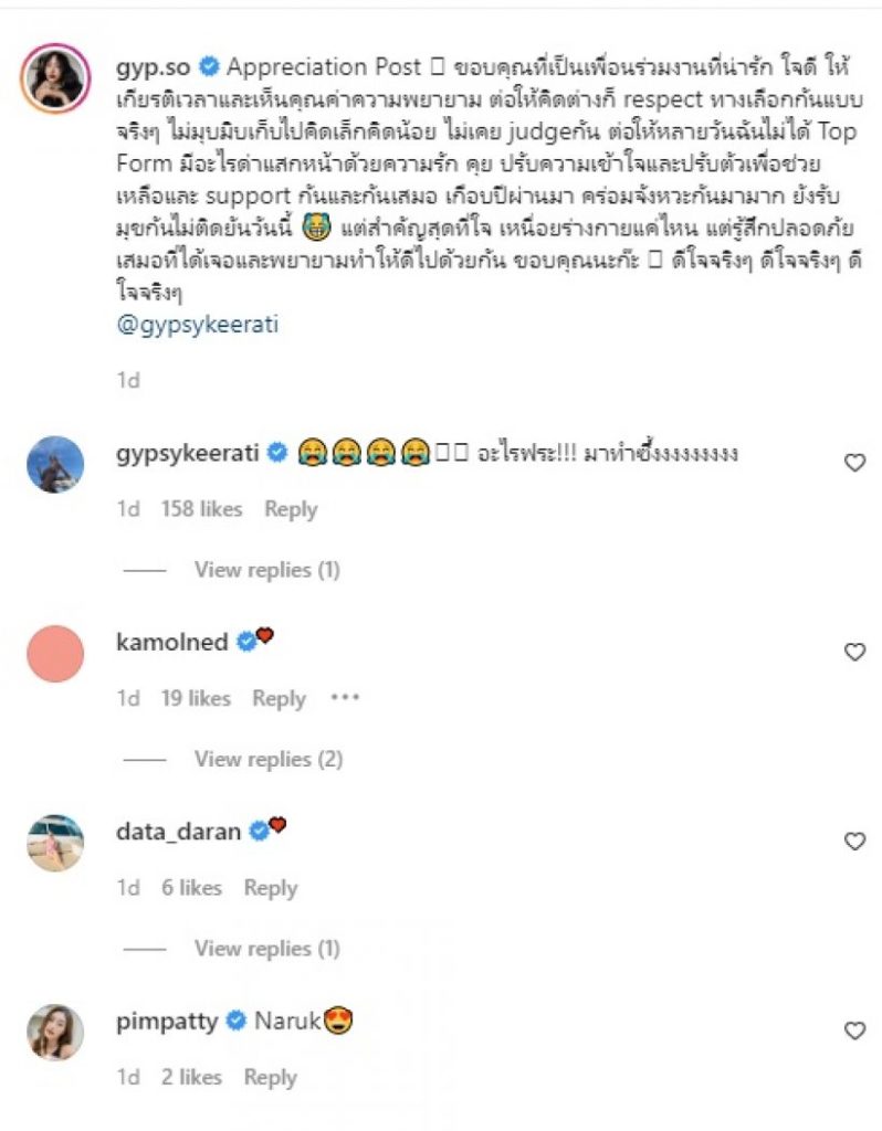 ล่าสุด ยิปโซ ได้ร่ายยาวพรั่งพรูความในใจถึงพี่สาวคนสวยว่า “Appreciation Post ขอบคุณที่เป็นเพื่อนร่วมงานที่น่ารัก ใจดี ให้เกียรติเวลาและเห็นคุณค่าความพยายาม ต่อให้คิดต่างก็ respect ทางเลือกกันแบบจริงๆ ไม่มุบมิบเก็บไปคิดเล็กคิดน้อย ไม่เคย judgeกัน ต่อให้หลายวันฉันไม่ได้ Top Form มีอะไรด่าแสกหน้าด้วยความรัก คุย ปรับความเข้าใจและปรับตัวเพื่อช่วยเหลือและ support กันและกันเสมอ