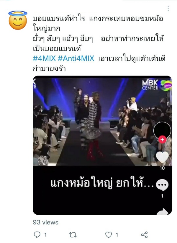 และวิจารณ์ถึงคอนเซ็ปท์ของวงและท่าเต้นโดยใช้คำหยาบคาย งานนี้แฟนคลับได้เห็นโพสต์เข้า ถึงกับควันออกหู ต้องออกโรงมาปกป้องหนุ่ม ๆ กันแน่นฟีด โดยเรื่องนี้ถือเป็นครั้งแรกตั้งแต่เดบิ้วต์ ที่มีแอนตี้แฟนมาคุกคามและวิจารณ์ด้วยถ้อยคำหยาบคาย ยังไงก็ขอให้กำลังใจสมาชิกวง 4MIX ผ่านพ้นดราม่าครั้งนี้ไปได้ และทำงานให้เต็มที่ต่อไปนะคะ