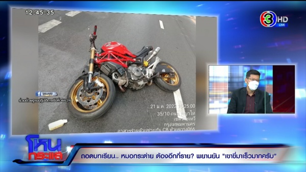 พ.ต.อ.สุกิจ : อย่างที่คุณหมอแจ้ง ถ้าเราจะดำเนินคดีในเรื่องขับรถโดยไม่คำนึงถึงความปลอดภัย เราต้องดูถึงพฤติการณ์ขับขี่ของผู้ขับขี่ด้วย แต่ที่แน่ ๆ ที่เราเห็นในภาพ การที่เขาออกโค้งแล้วตีขวาทันที มันค่อนข้างผิดกฎหมายอยู่แล้ว พนักงานสอบสวนมีการแจ้งข้อหาแล้ว ปกติรถจักรยานยนต์ต้องขับรถโดยไม่ชิดขอบด้านซ้าย อันนี้ภาพก็ฟ้องยู่แล้ว
