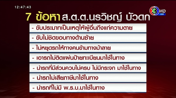 โดนไป 7 ข้อหา ขับประมาทเป็นเหตุให้ผู้อื่นถึงแก่ความตาย , ขับไม่ชิดขอบทางด้านซ้าย, ไม่หยุดรถให้คนข้ามทางม้าลาย, เอารถไม่ติดแผ่นป้ายทะเบียนมาใช้, รถที่มีส่วนควบไม่ครบ ไม่มีกระจกนำมามาใช้, นำรถไม่เสียภาษีมาใช้ , นำรถไม่มีพ.ร.บ.มาใช้ 7 ข้อหานี้ เขาเป็นตร.แน่ ๆ เหรอ?